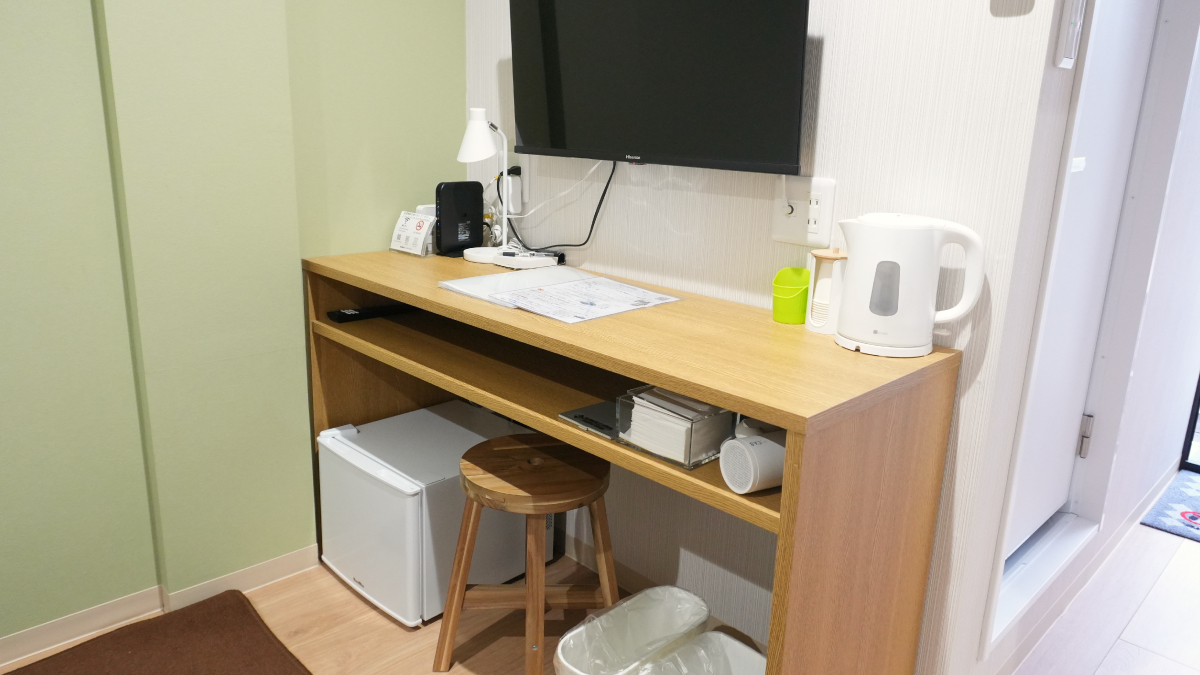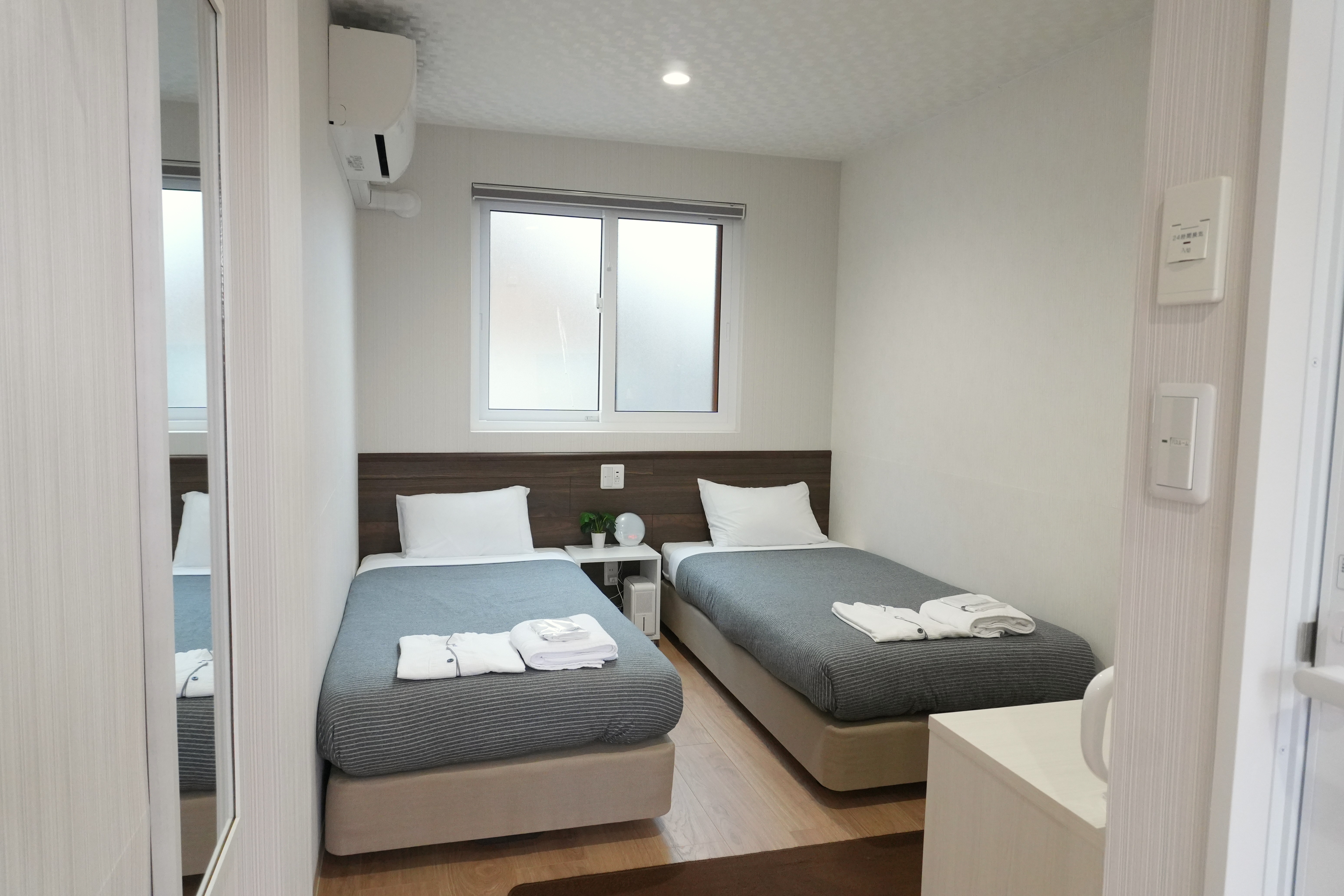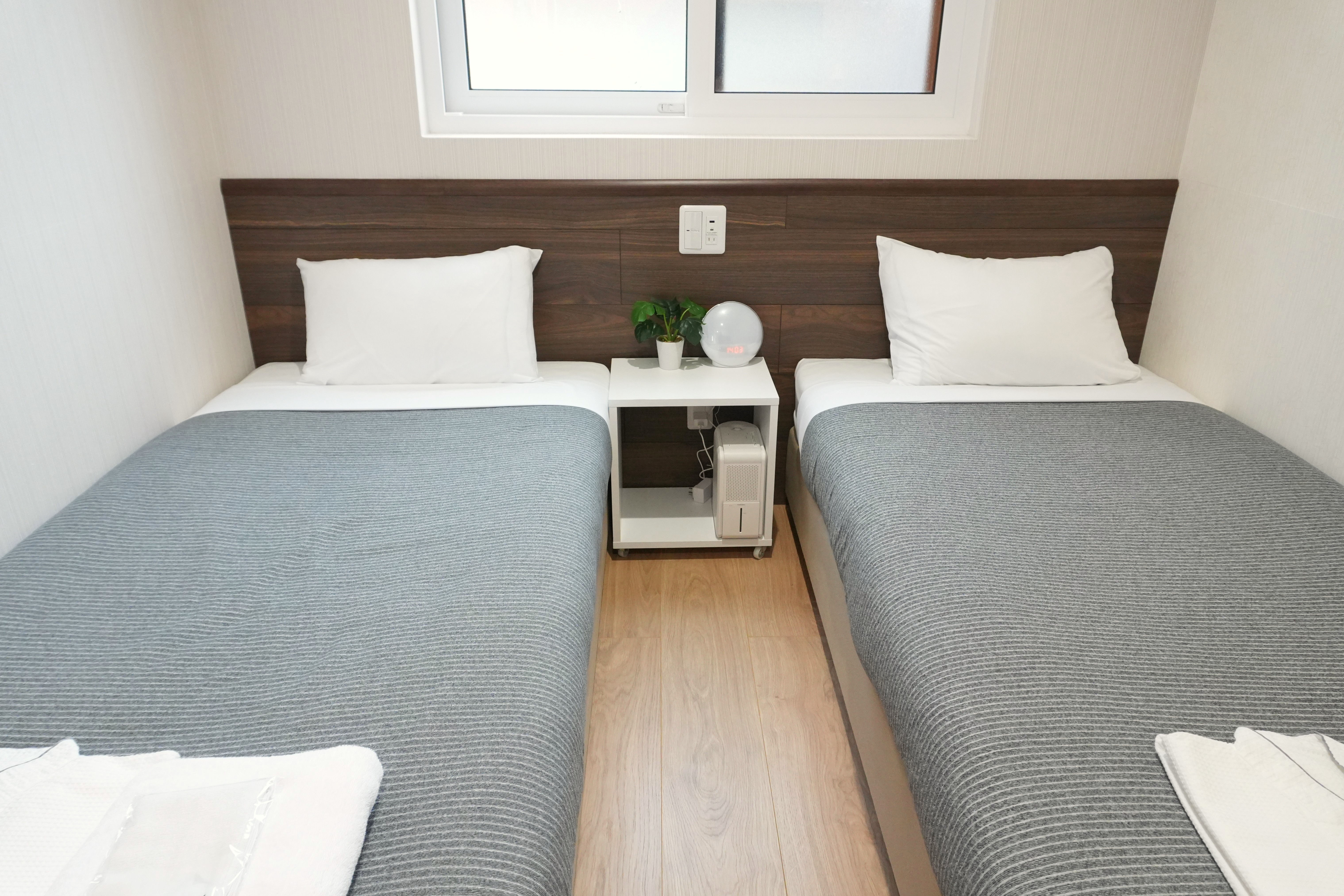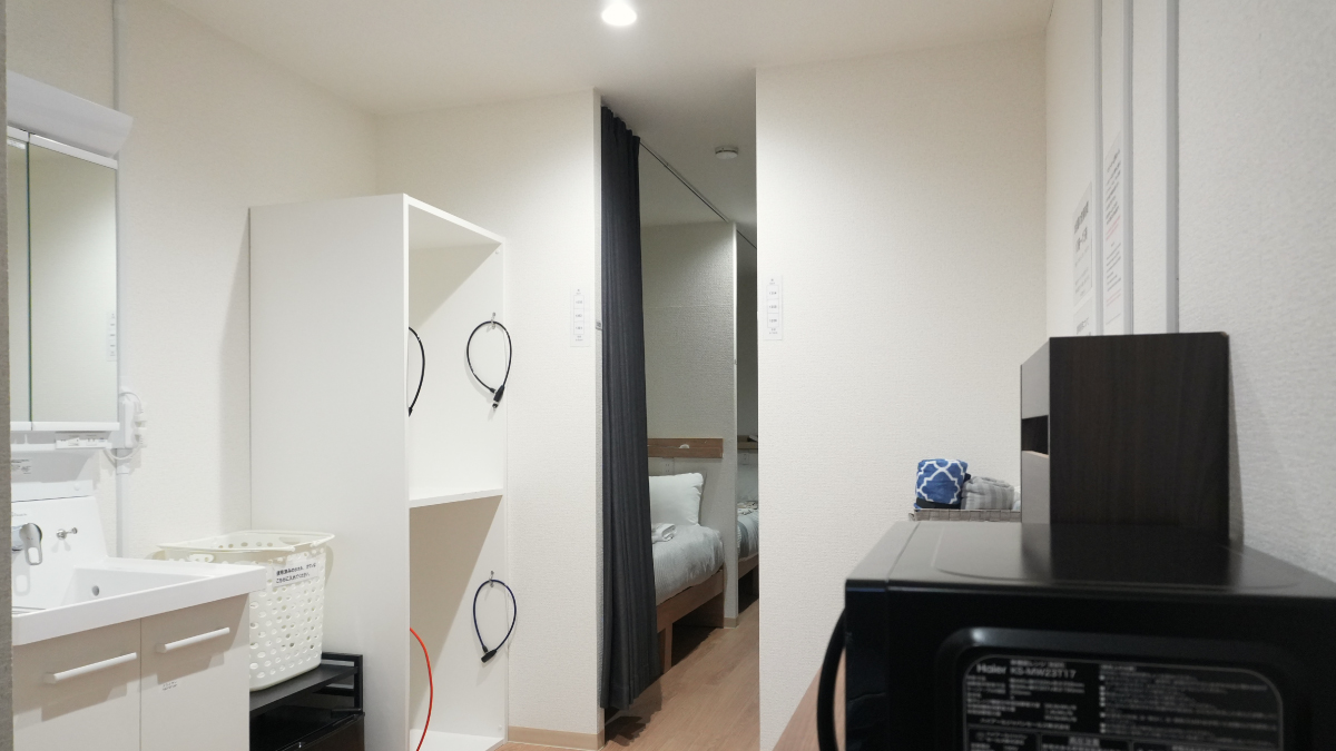 相部屋のため23時以降はチェックインできません。共用部部にカウンターテーブル、シャワールームとトイレ、洗面台2台、冷蔵庫設置。バスタオル、フェイスタオル、ナイトウエア完備。(3日間交換なし)