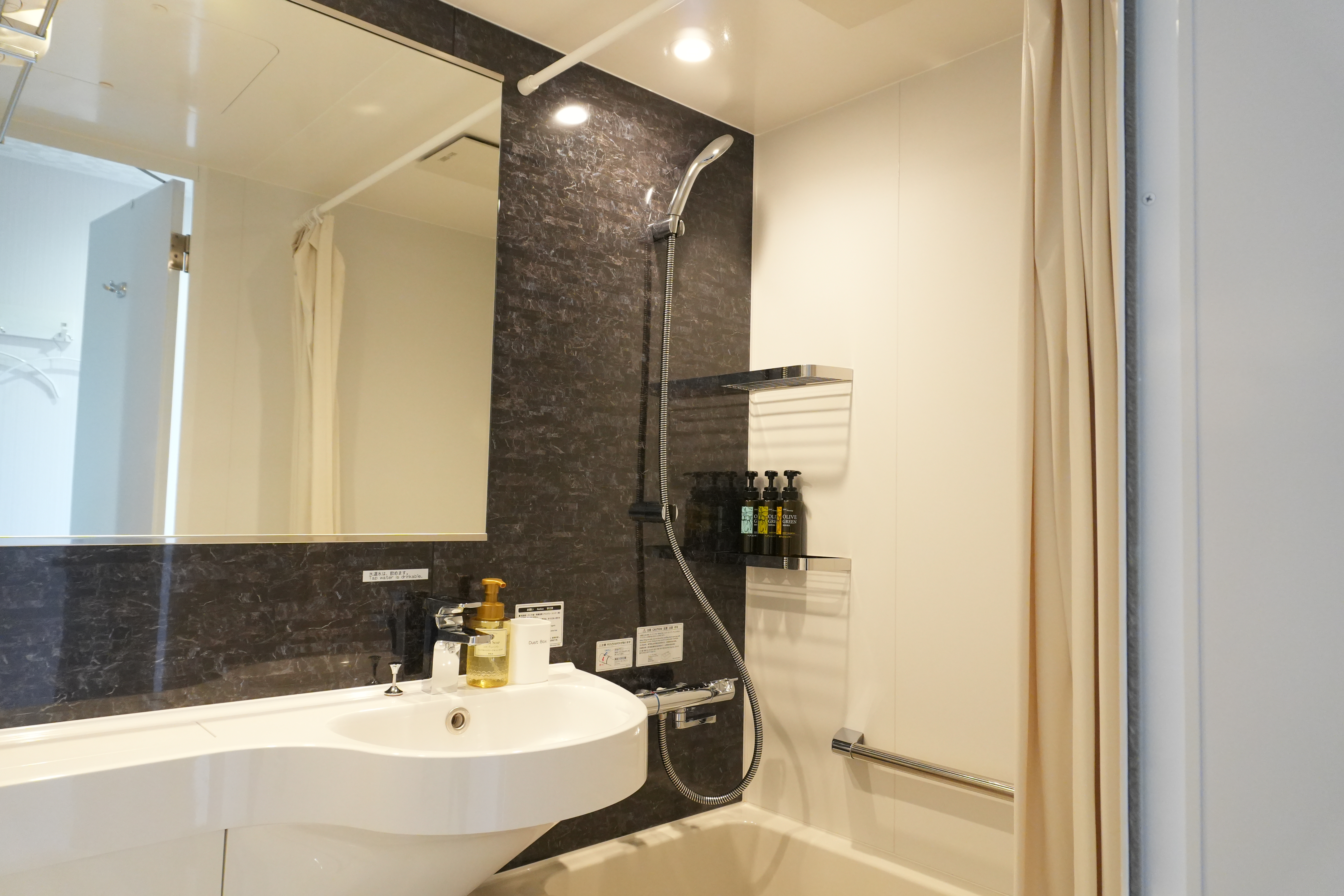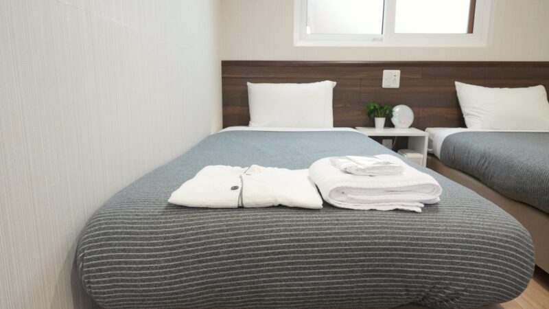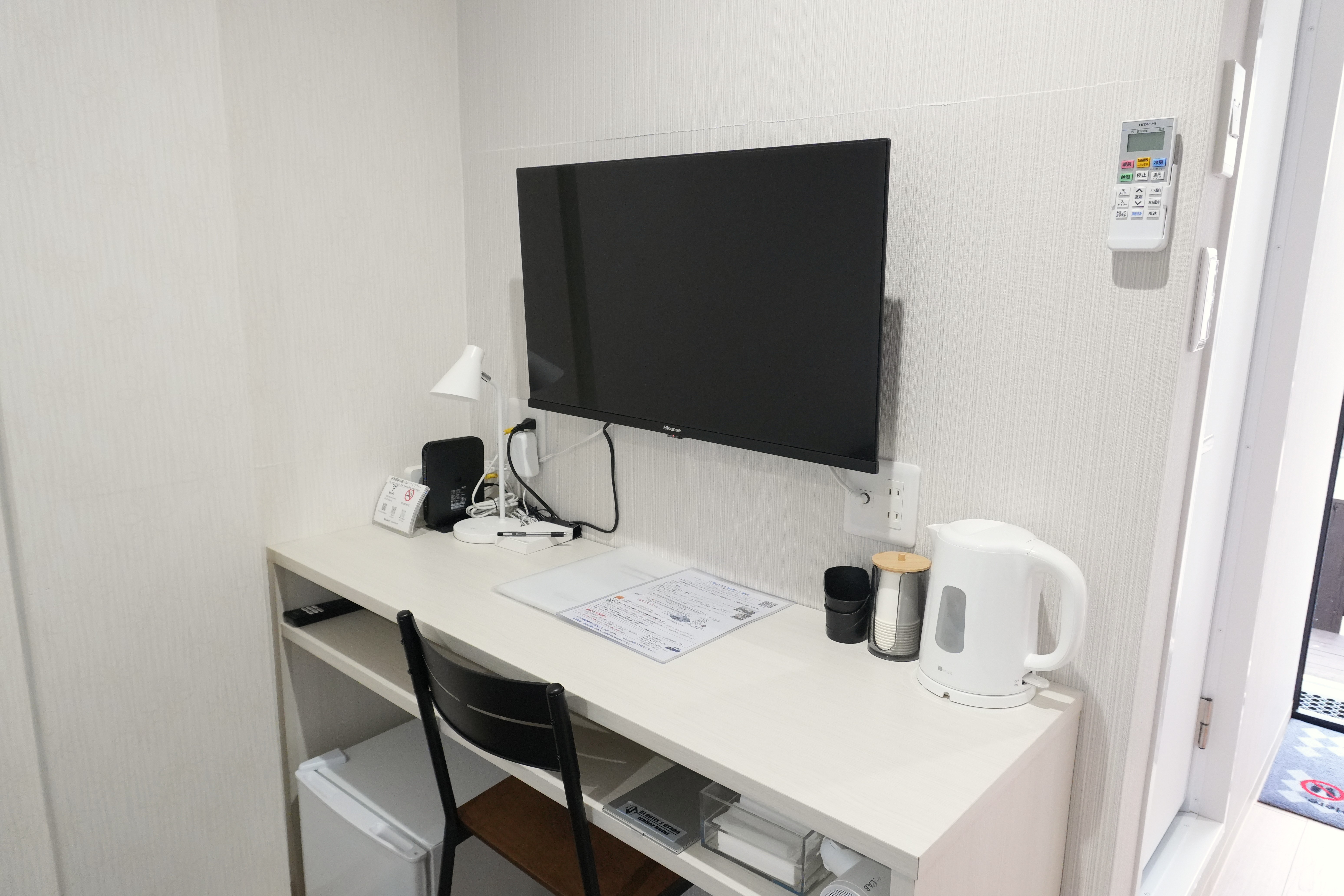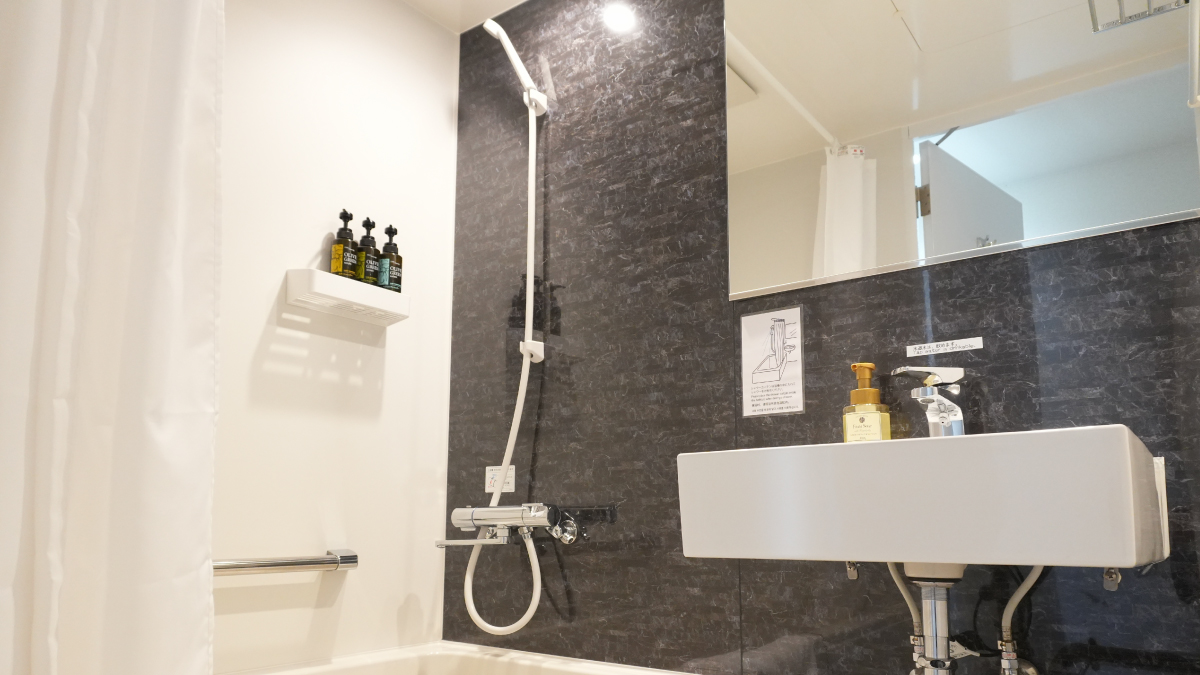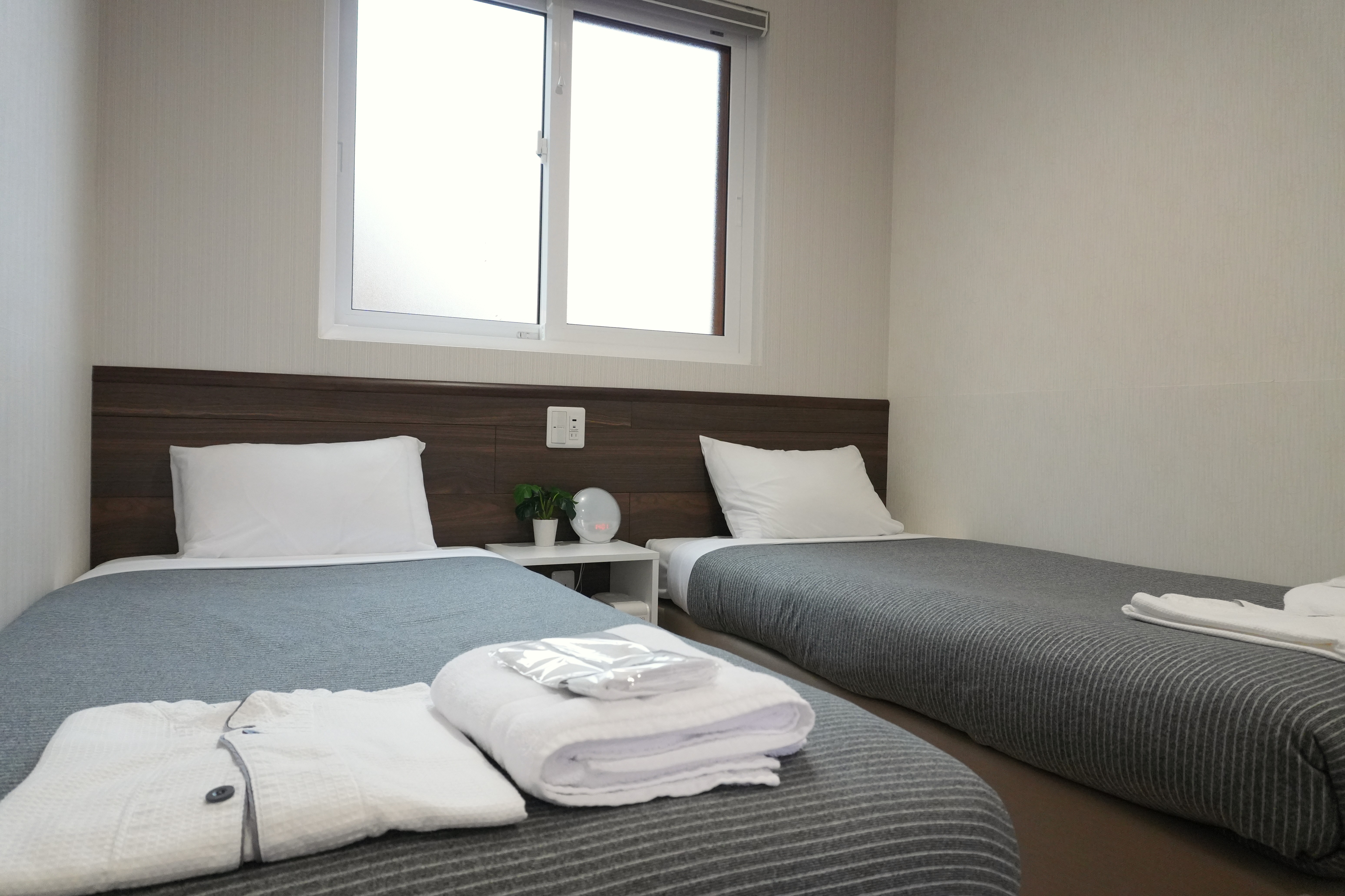 相部屋のため23時以降はチェックインできません。共用部部にカウンターテーブル、シャワールームとトイレ、洗面台2台、冷蔵庫設置。バスタオル、フェイスタオル、ナイトウエア完備。(3日間交換なし)