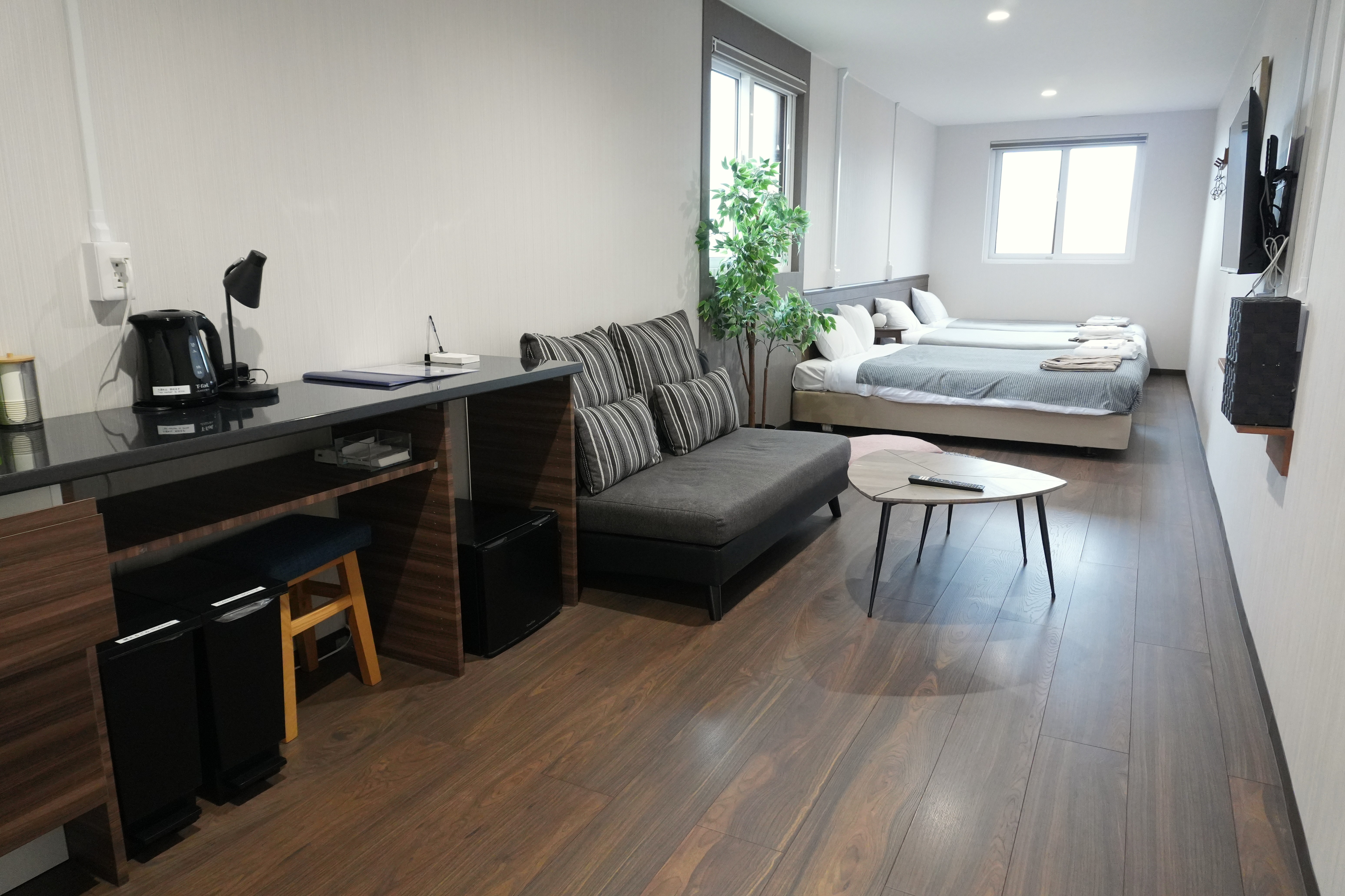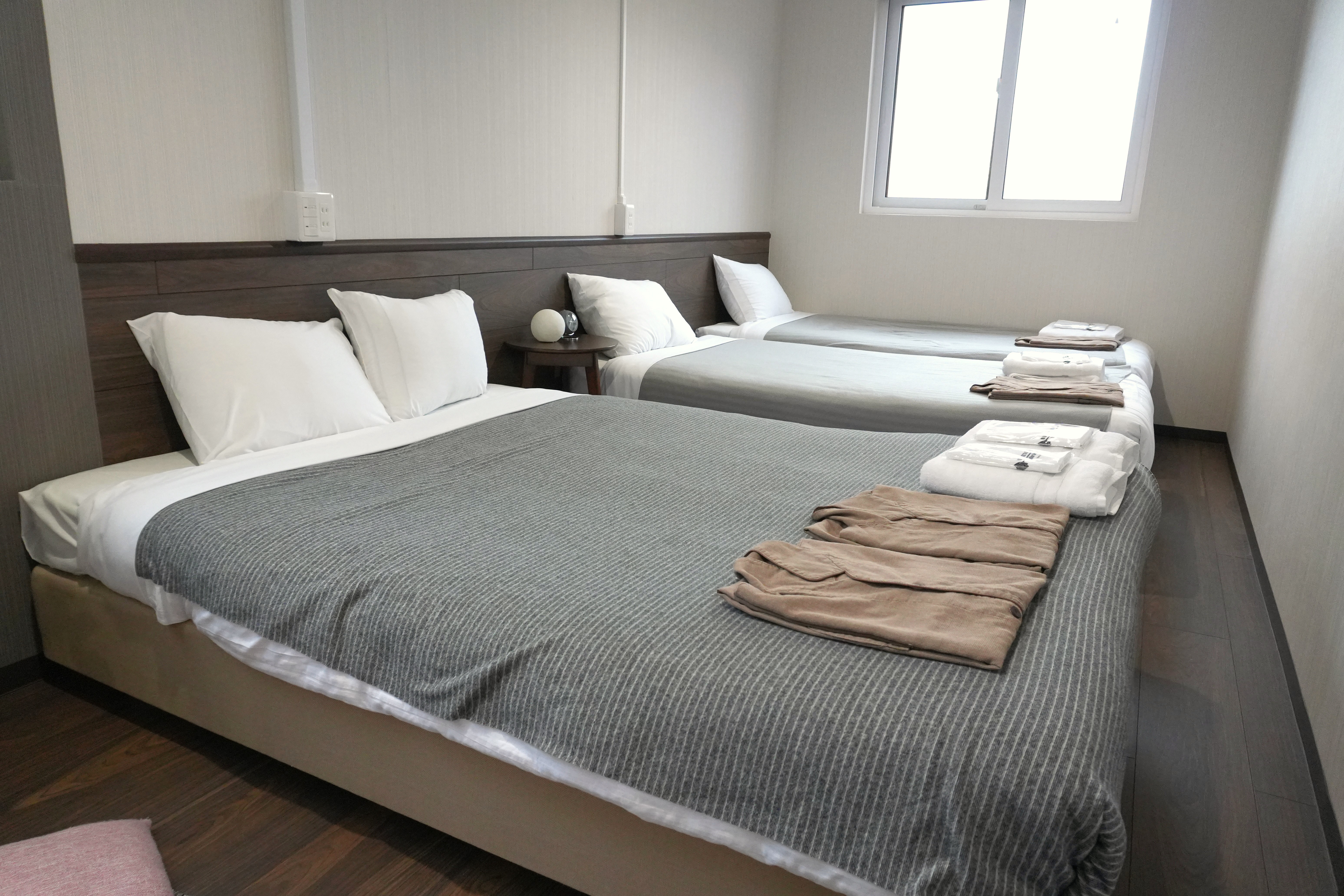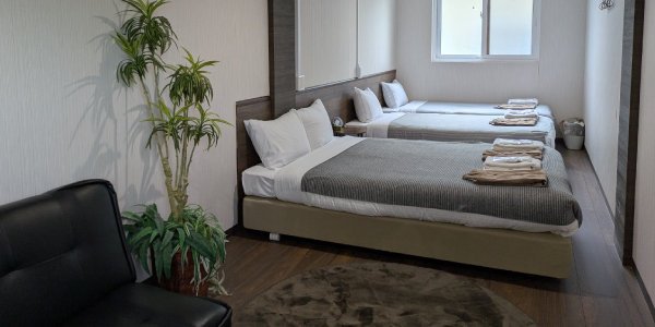 部屋前に駐車場を完備。約30㎡のお部屋にダブルベッド1台、シングルベット2台と洗面台付きの多目的カウンター、ソファー、テーブルがあり皆様で楽しい室内時間を過ごせます。ベッドは全てフランスベッドを採用。大人4名まで宿泊可能、添い寝のお子様(小学生低学年まで)は無料です。