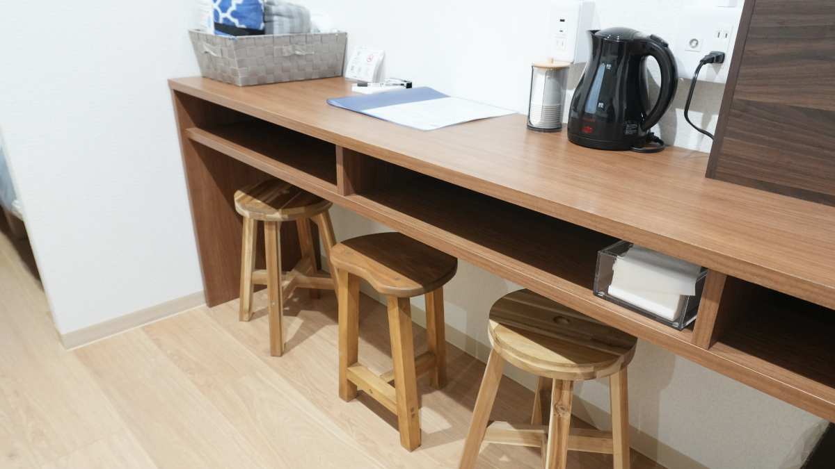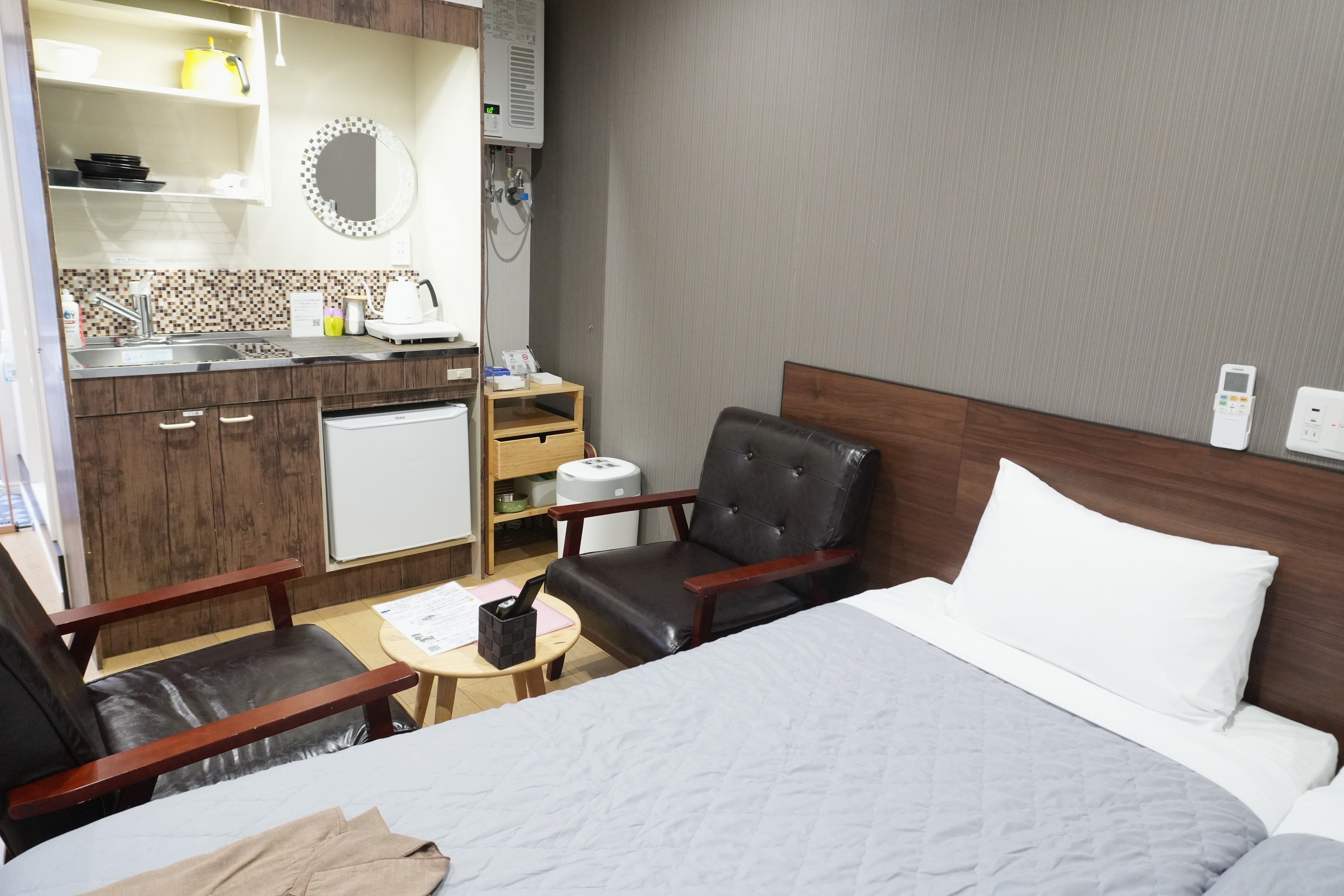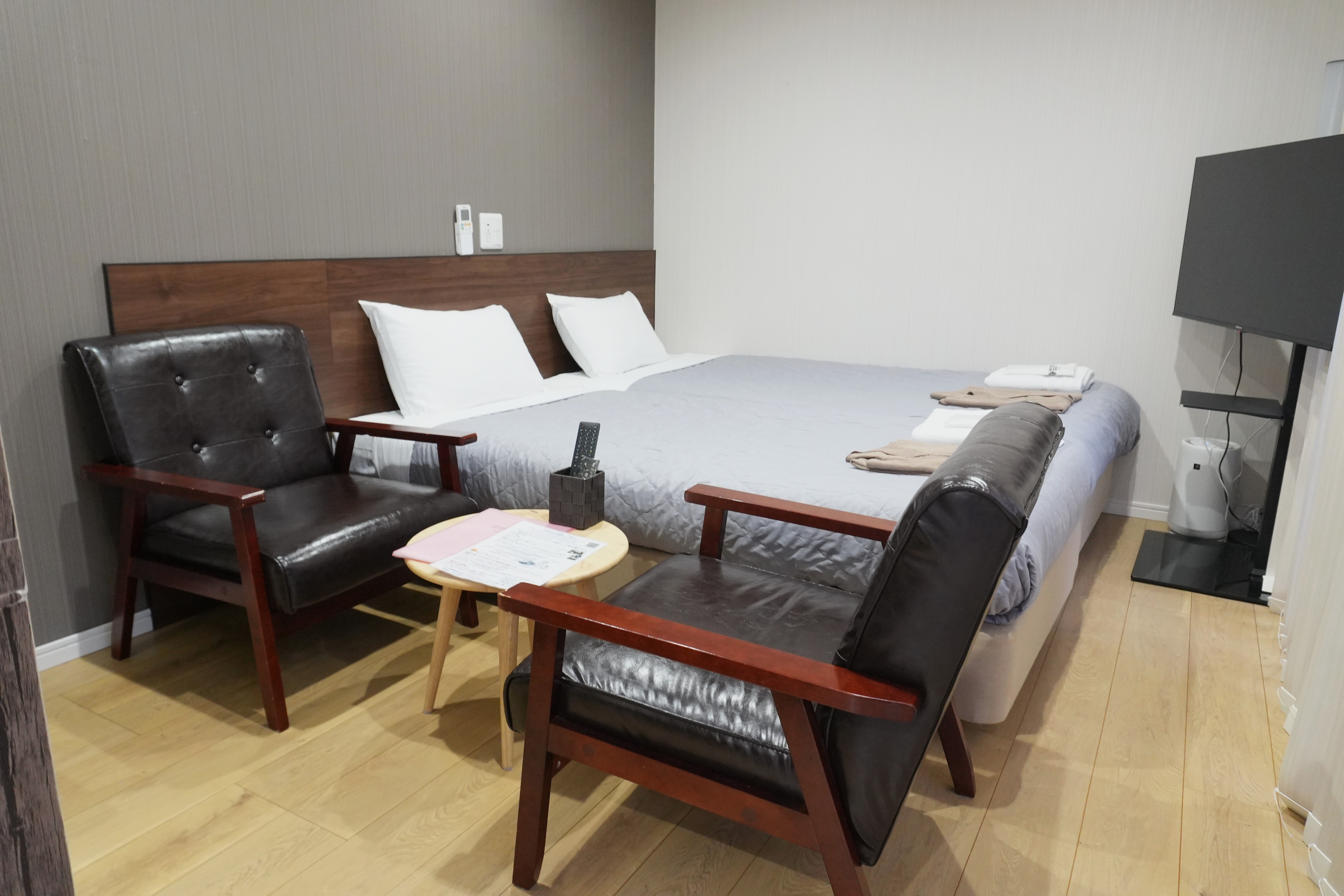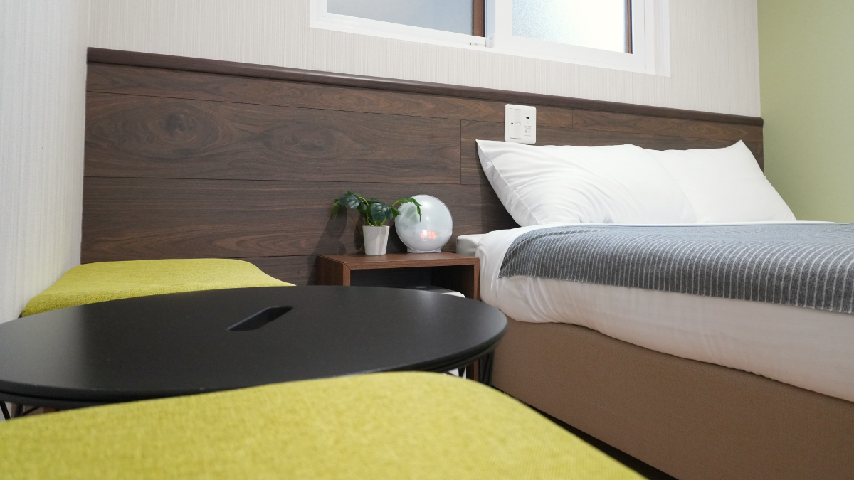 約14㎡のお部屋に140㎝幅ダブルベッド1台にイス・テーブルを配置したワンルーム風レイアウトで部屋時間をゆっくりしたい方や長期滞在にもおすすめの2部屋限定のお部屋です。